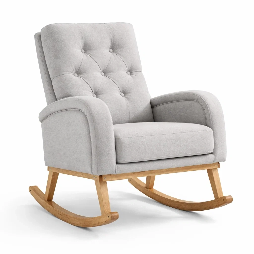 Fauteuil à bascule en tissu polyester gris avec base en bois massif