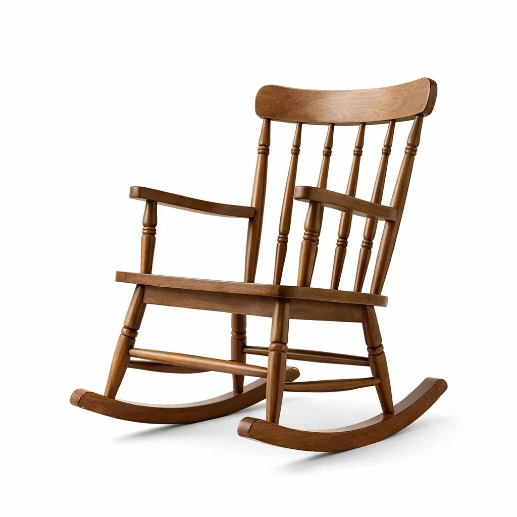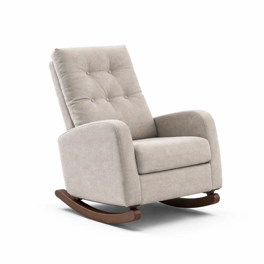 Fauteuil à bascule en tissu avec accoudoirs en bois et structure en métal