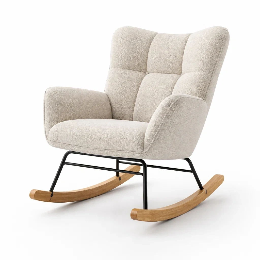 Fauteuil à bascule en tissu beige avec structure en métal et bois