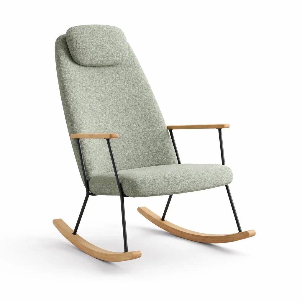 Ce fauteuil à bascule est confectionné en tissu polyester avec une structure en acier et des accoudoirs en bois. Il mesure 105x55x80 cm et supporte un poids maximal de 120 kg. La couleur principale est le vert. L'entretien nécessite un nettoyage avec un chiffon humide.