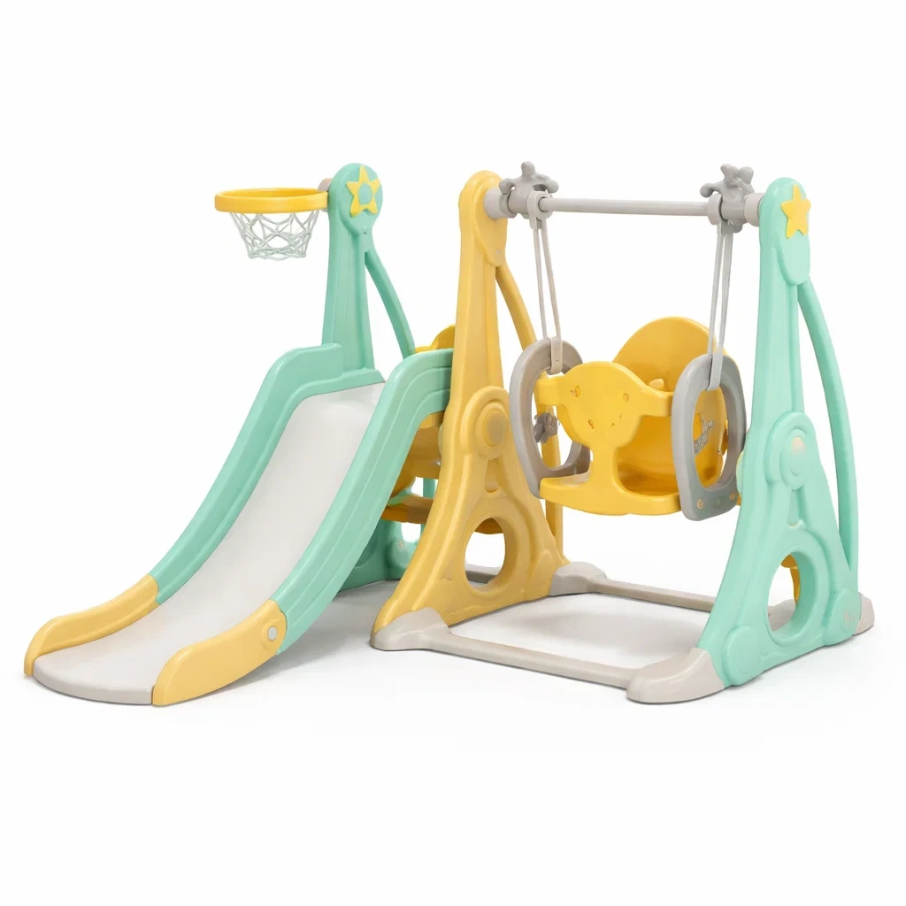 Aire de jeu pour enfants comprenant un toboggan, une balançoire et un panier de basket. Fabriquée en plastique polyéthylène durable, elle offre une sécurité optimale pour les enfants.